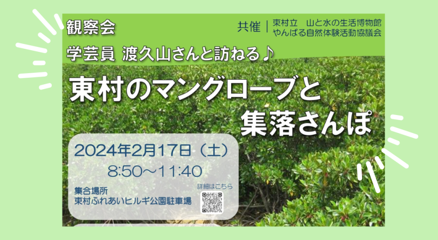 観察会「学芸員 渡久山さんと訪ねる♪ 東村のマングローブと集落さんぽ」 が開催されます