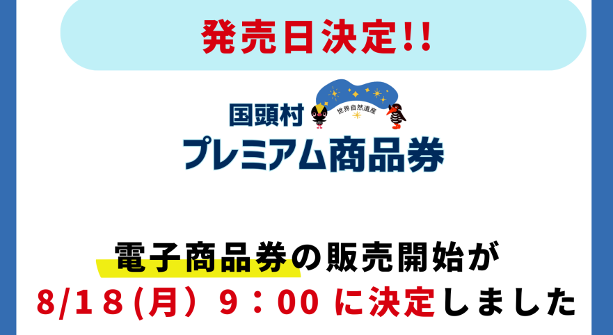 延期しておりました、国頭村プレミアム付き商品券の電子商品券について、 8月18日(月)9:00~に決定いたしました。